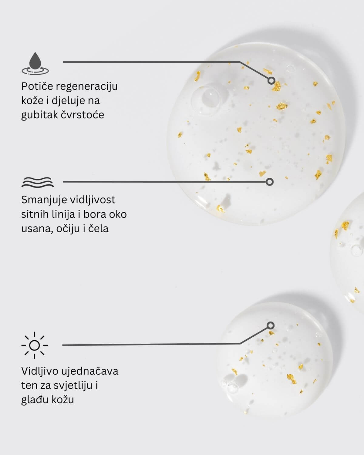 Učinkovito djeluje na fine linije, posvjetljuje i dubinski hidratizira, ostavljajući kožu blistavom. Naša jedinstvena mješavina, uključujući 24K zlato, niacinamid i hijaluronsku kiselinu, jača zaštitnu barijeru kože i poboljšava ukupnu teksturu kože.